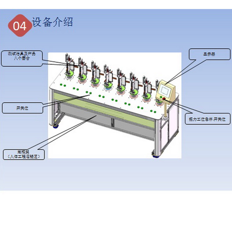八工位轉軸磨合試驗機適用於轉軸、鉸鏈、hinge等產品跑合壽命耐久測試。采用一機多工位,大大提高測試效率。 每個工位獨立設置參數,獨立操作,給使用者提供更多的操作便利。每個工位間距充分,操作中不會幹涉。
